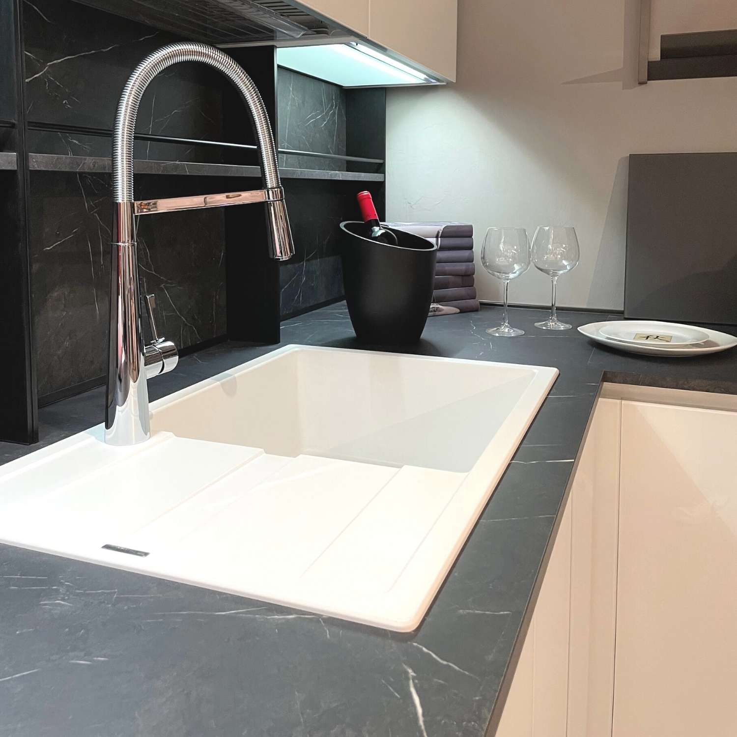 Finitura glass lucido bianco. Gres porcellanato noir. Elementi sottopensili attrezzati.